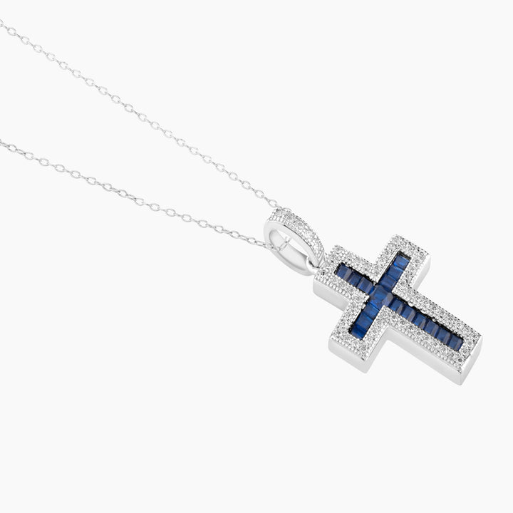 Experience the captivating beauty of our Sterling Silver Synthetic Blue Spinel and Cubic Zirconia Cross Pendant, featuring an Art Deco-inspired design with an outer frame of sparkling pave cubic zirconia and an inner arrangement of radiant blue baguette spinels. Suspended gracefully from an 18-inch chain, this exquisite pendant captures the essence of the Art Deco era.