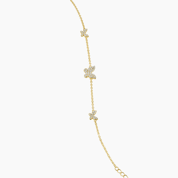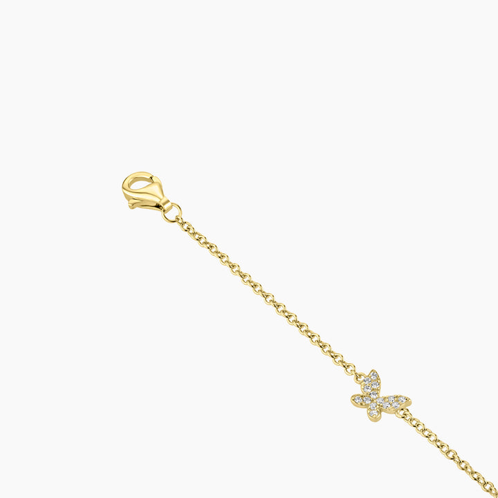 This beautiful bracelet features a sparkling butterfly design with pave cubic zirconia stones set in gold-plated sterling silver. The delicate chain measures 6.5 inches with a 1-inch extension, making it easy to adjust to the desired length. The lobster clasp ensures a secure fit on the wrist. The intricate design of this piece makes it a perfect accessory for any occasion, adding a touch of elegance to any outfit.