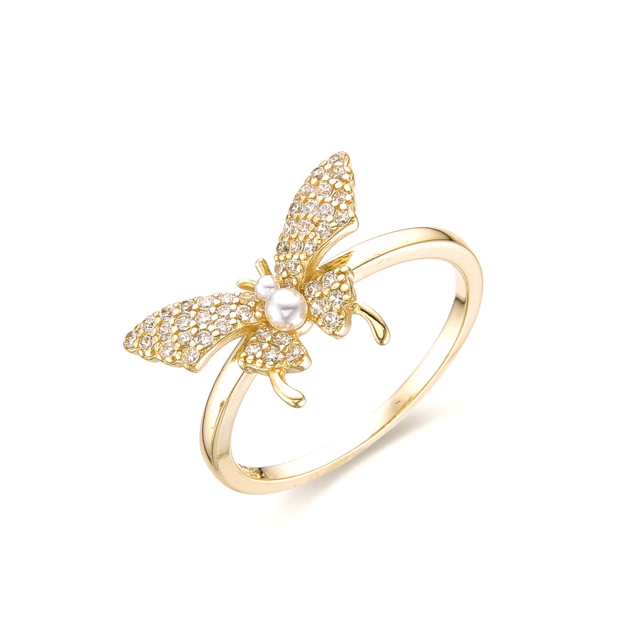 This elegant gold-tone Sterling Silver butterfly ring is a stunning combination of whimsy and sophistication. Adorned with dazzling Cubic Zirconia and a central pearl accent, the butterfly design symbolizes grace and transformation. Perfect for adding a touch of glamour to any outfit, this ring makes a standout statement for both casual and formal occasions.