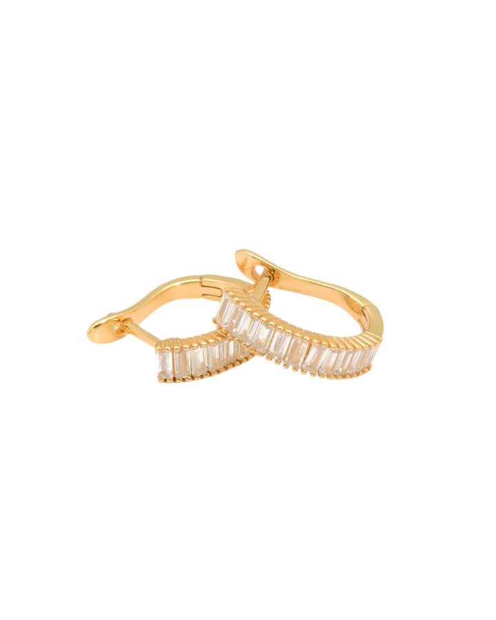 These elegant gold-plated sterling silver hoop earrings showcase a sophisticated design featuring shimmering baguette-cut stones. The baguettes are meticulously arranged along the hoops, creating a continuous line of sparkle that catches the light with every movement.