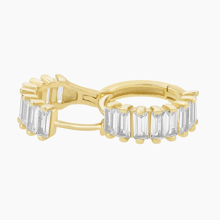 Step into the world of art deco glamour with our Baguette Brilliance Huggie Earrings. These earrings, meticulously crafted from gold-plated sterling silver, feature a radiant pave of clear cubic zirconia baguettes. The perfect balance between classic elegance and contemporary design, these huggies are a dazzling addition to any jewelry collection. Make them your go-to accessory for both daily refinement and special occasion sparkle.