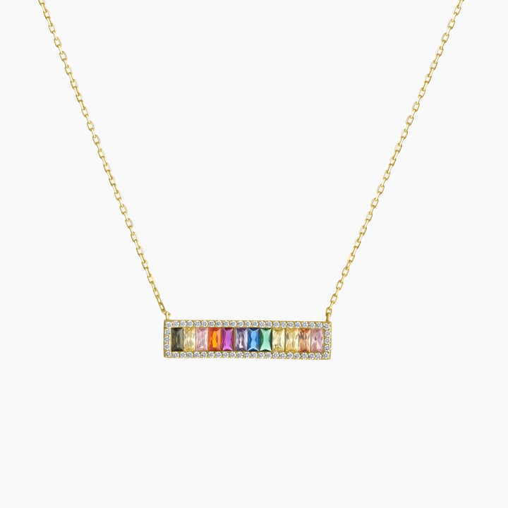 This stunning Gold Plating Over Sterling Silver Multi Colored Baguette Cubic Zirconia 16"+2" Bar Necklace features a beautiful arrangement of multi-colored baguette cubic zirconia stones, delicately framed by a clear pave cubic zirconia border. The necklace is perfect for adding a pop of color to any outfit, and the 16"+2" chain length ensures it will fit comfortably on every neck sizes.