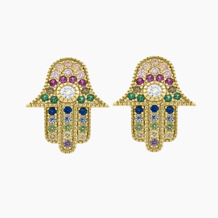 Add a touch of spirituality to your style with these beautiful Gold Plating Over Sterling Silver Hamsa Stud Earrings. The Hamsa hand is a traditional symbol of protection and good luck, and these earrings feature a delicate and intricate design that is sure to catch the eye. Each earring is set with multiple colored cubic zirconia stones, creating a stunning rainbow effect. These earrings are perfect for adding a pop of color to any outfit and make a great gift for a loved one.