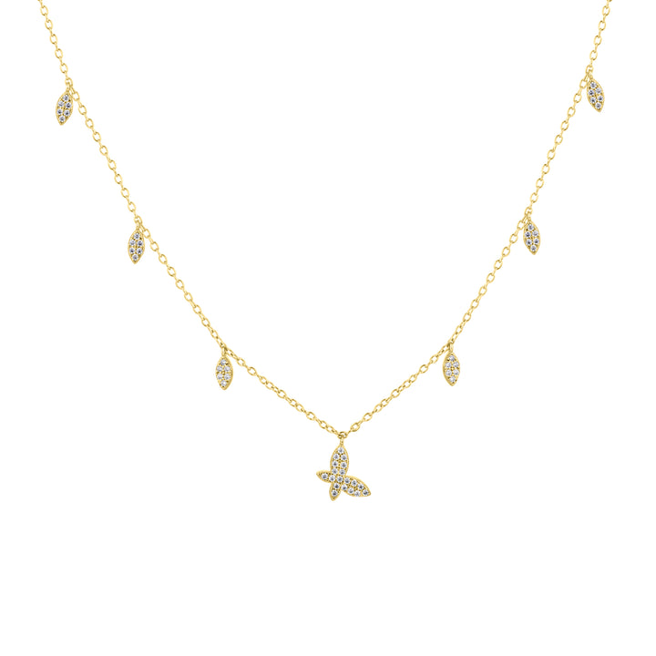 This exquisite necklace features a delicate butterfly pendant that is elegantly crafted from gold-plated sterling silver. The pendant is studded with shimmering cubic zirconia stones in a pave setting, which adds a touch of sparkle and glamour to the piece. The pendant is suspended from a dainty 16-inch cable chain with a 2-inch extender, allowing for easy adjustment to find the perfect fit. This necklace is perfect for adding a touch of whimsy and charm to any outfit.